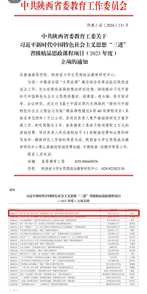 近日,中共陕西省委教育工委正式公布了2023年度陕西省习近平新时代中国特色社会主义思想“三进”省级精品思政课程项目评审结果,公司赵东副教授申报的基于线上线下混合式的思想道德与法治教学互助学习模式建设与实践获批2023年省级精品思政课程立项这是公司继《马克思主义基本原理》、《中国近现代史纲要》之后再次获批的一项习近平新时代中国特色社会主义思想“三进”省级精品思政课。