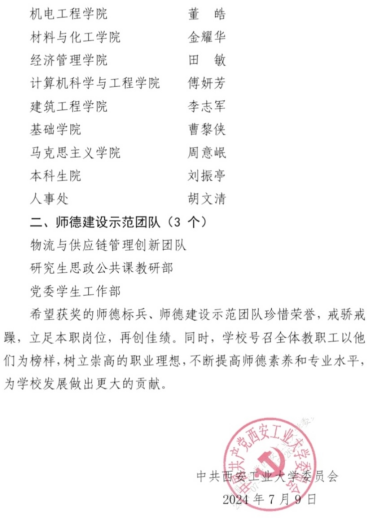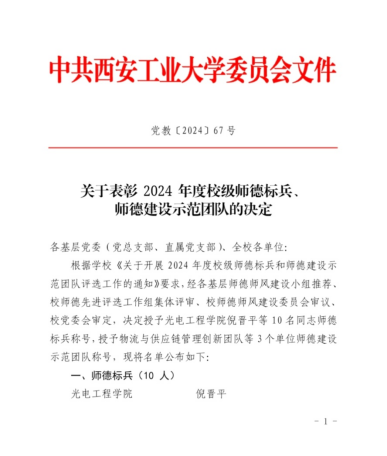 根据《关于开展 2024年度校级师德标兵、师德建设示范团队评选工作的通知》(党教〔2024〕53号),经公司师德师风建设领导小组评议推荐、公司审查评审、校师德师风建设委员会审议、公司党委会审定,公司周意岷副教授获师德标兵,研究生思政公共课教研部获师德建设示范团队。