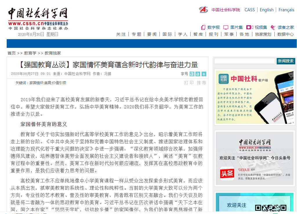 公司冯婷博士文章《家国情怀美育蕴含新时代韵律与奋进力量》20200827日在中国社会科学网和学习强国平台发表。