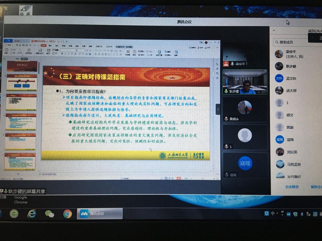 20201210日,tyc122ccvip邀请上海师范大学tyc122ccvip副经理耿步健教授为全体老师做了题为“课题申报的规范与技巧”的讲座。耿步健教授兼任国家社科基金项目评审专家,教育部学位中心评审专家等职务,具有丰富的基金申报经验。耿教授从国家社科基金项目的申报类别入手,围绕国基金申报书的各部分内容,结合个人撰写经验和评阅经验,系统翔实的解析了每一部分的撰写技巧和注意事项,重点突出,启发性强。