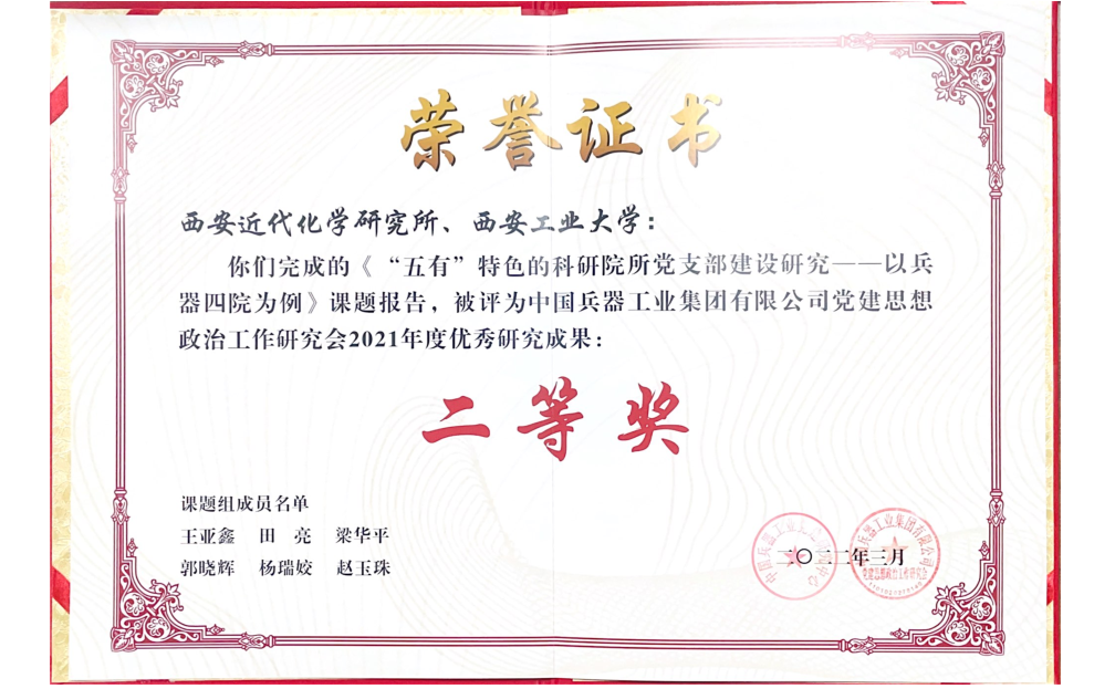 由西安近代化学研究所作为牵头单位,联合tyc122ccvip共同完成的课题《“五有”特色的科研院所党支部建设研究—以兵器四院为例》荣获中国兵器工业集团有限公司党建思想政治工作研究会2021年度优秀研究成果二等奖。课题由公司梁华平副教授(唯一执笔人)执笔完成。课题研究过程中,对西安近代化学研究所的392名普通党员及党员领导干部进行了调研。结合调研情况,课题主要从新时代加强科研院所党支部建设的重要意义、新时代加强科研院所党支部建设的逻辑理路、彰显新时代“五有”特色党支部建设的新内涵、彰显新时代“五有”特色的党支部建设新举措及彰显新时代“五有”特色的党支部建设的新成效等五个部分进行了研究。