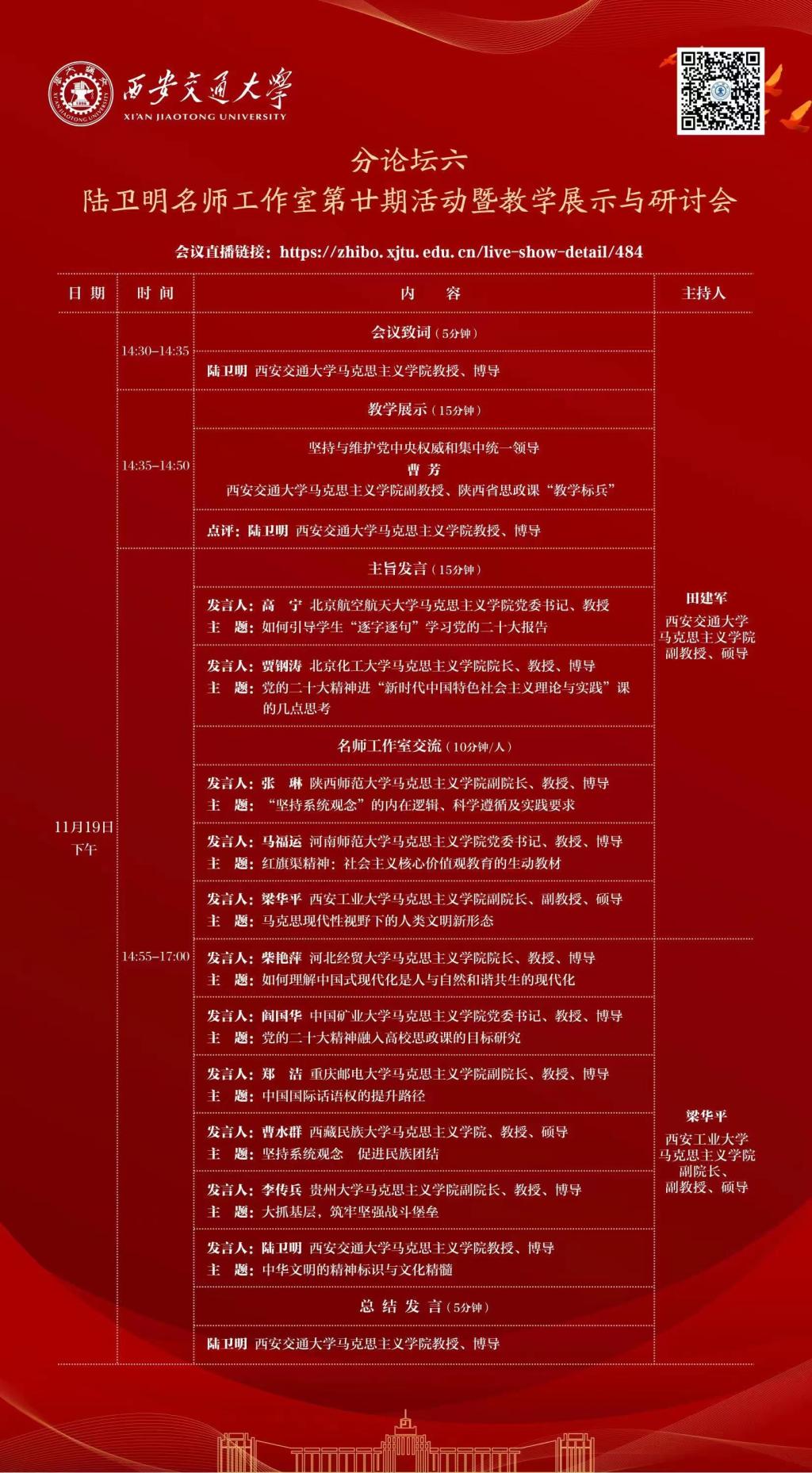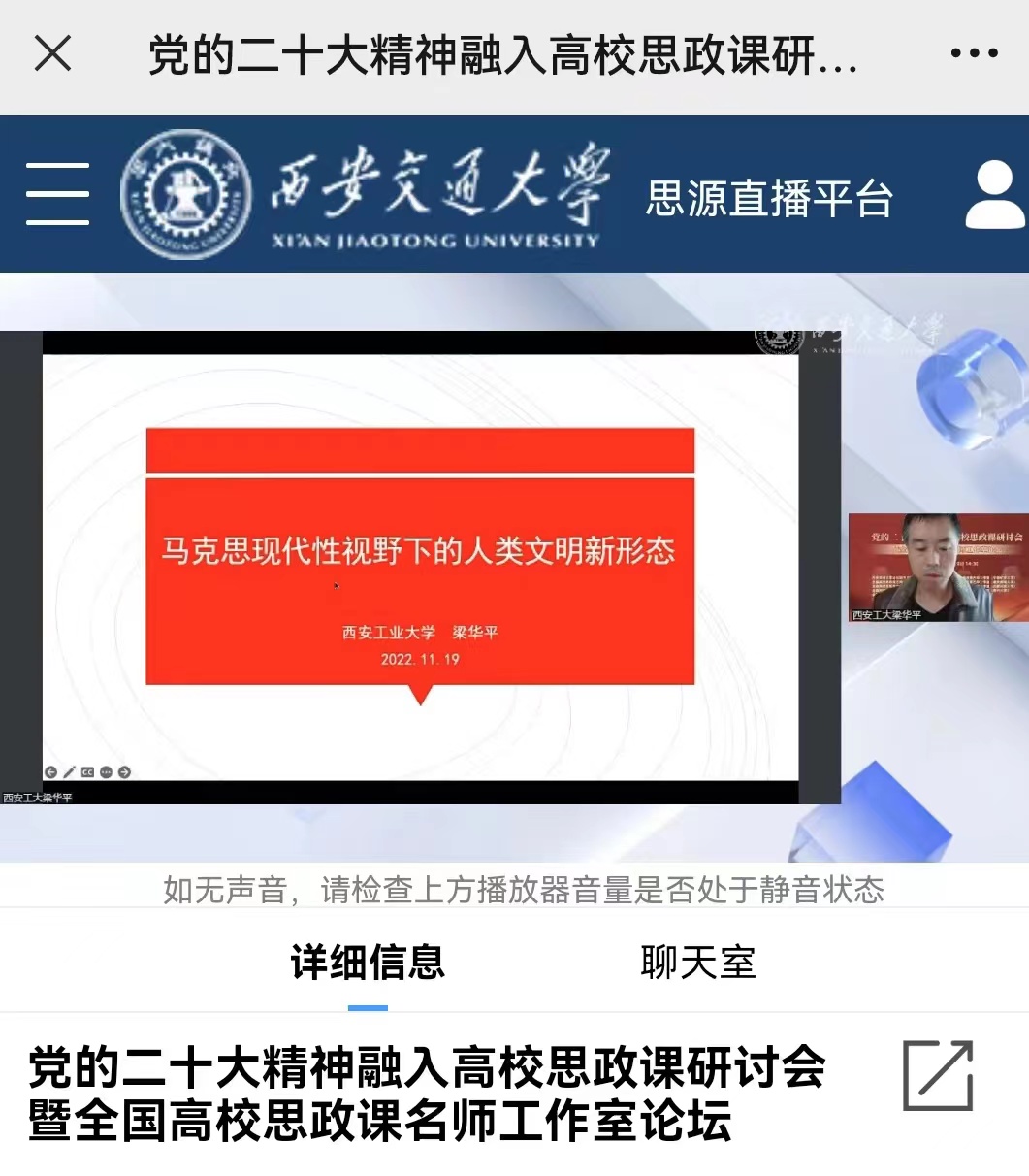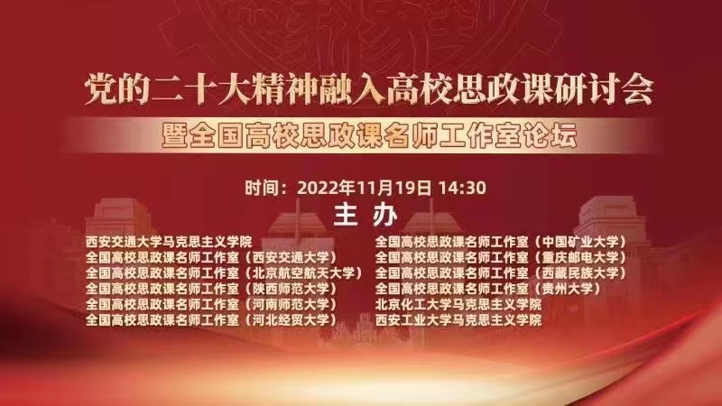 2022年11月19日,由公司与西安交通大学tyc122ccvip、全国高校思政课名师工作室(西安交通大学等)共同主办的党的二十大精神融入高校思政课研讨会暨全国高校思政课名师工作室论坛成功举办。来自西安交通大学、北京航空航天大学、北京化工大学、陕西师范大学、河南师范大学、tyc122ccvip、河北经贸大学、中国矿业大学、重庆邮电大学、西藏民族大学、贵州大学等11所高校的12位专家学者做了精彩发言。本次研讨会通过腾讯会议和交大思源直播平台直播,来自全国各地超过8000余名师生在线参加会议或收看直播。