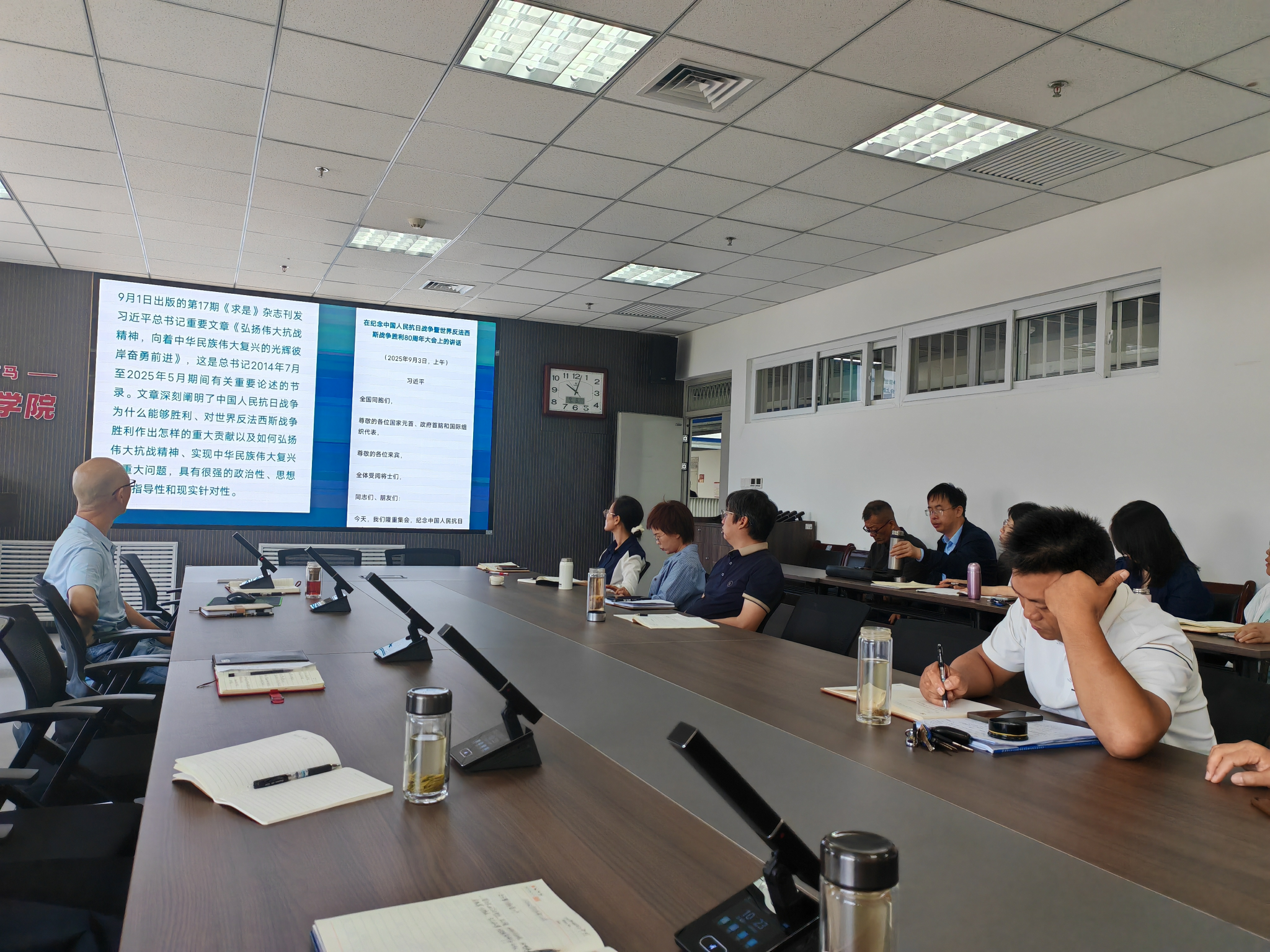 会议学习了习近平总书记的重要文章《弘扬伟大抗战精神,向着中华民族伟大复兴的彼岸奋勇前进》和习近平总书记在纪念中国人民抗日战争暨世界反法西斯战争胜利80周年大会上的讲话。会议围绕中国人民抗日战争是世界反法西斯战争的重要组成部分、中国人民为拯救人类文明保卫世界和平付出的巨大民族牺牲、中华民族的不畏强暴自立自强、中国人民在中国共产党倡导建立的抗日民族统一战线旗帜下取得近代以来反抗外敌入侵的第一次完全胜利、维护战后秩序构建人类命运共同体等内容,从不同角度进行了学习交流。