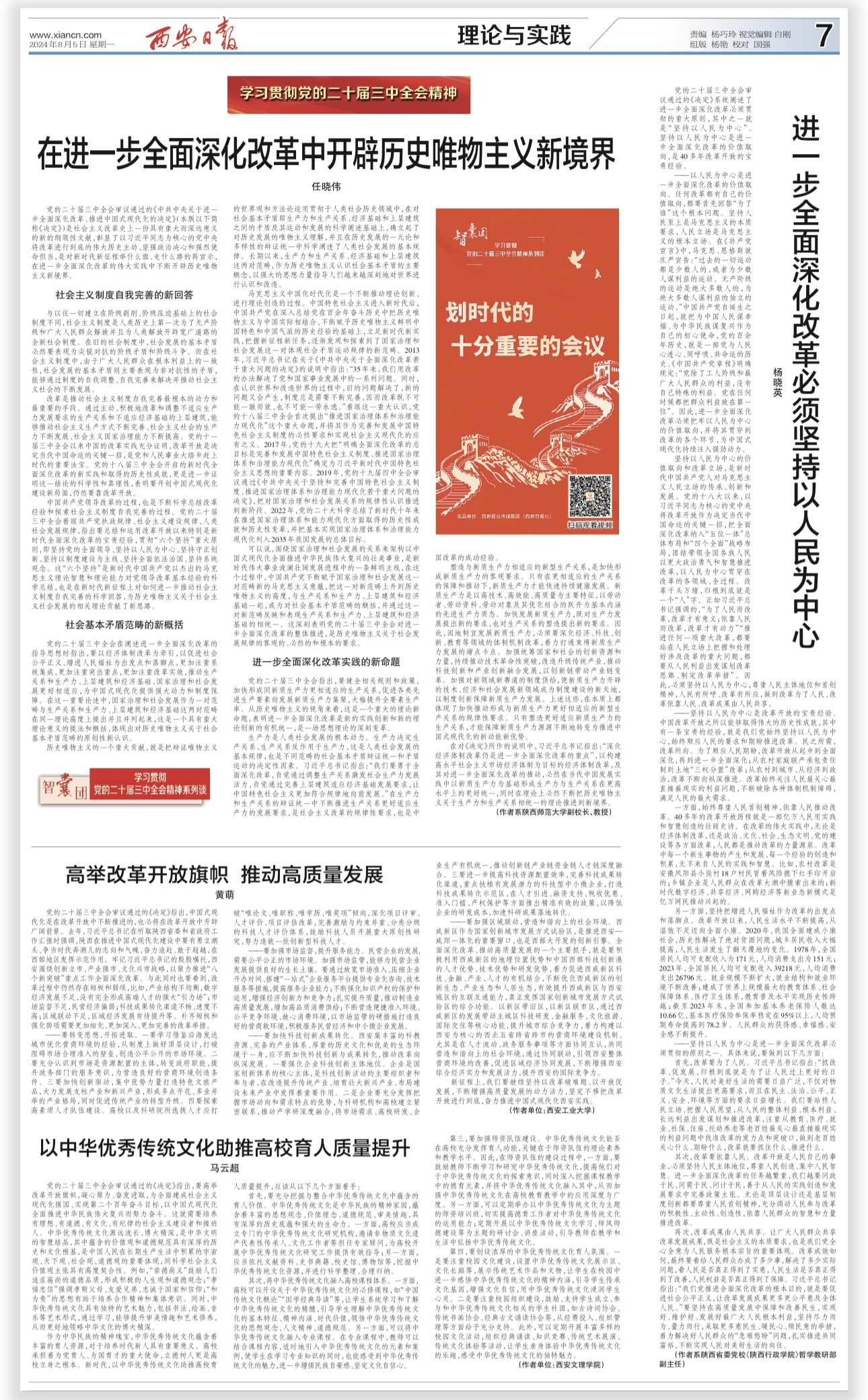 中国共产党第二十届中央委员会第三次全体会议召开以来,tyc122ccvip教师热切关注,积极通过网络、电视、新媒体平台等渠道收看相关报道,认真学习领悟全会精神,对党的创新理论开展研究阐释。公司教师寇瑶副教授、李山峰博士、黄萌博士、窦欢博士等撰写的理论文章在《西安日报》理论版陆续刊发,产生了积极的社会影响。