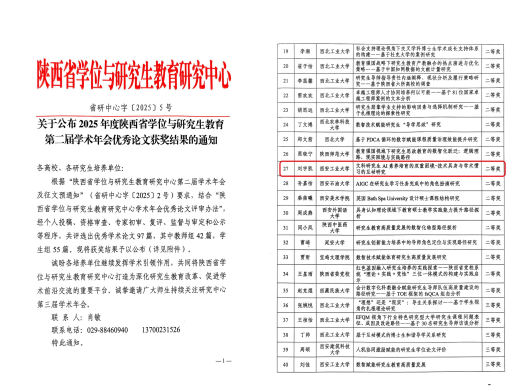 公司研究生刘宇凯荣获陕西省学位与研究生教育研究中心第二届学术年会二等奖
