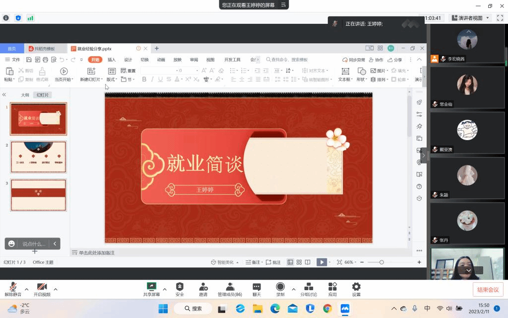 2023年2月11日下午,tyc122ccvip开展寒假就业分享会。本次会议通过腾讯会议平台线上开展,公司党委副书记李明芳、辅导员王亚茹以及公司全体研究生参与。本次会议由公司员工会主席李宏晓茜主持,本次会议邀请到三位曾就读于公司的优秀硕士毕业生张鑫、张丹、王婷婷,为同学们进行了就业指导和相关经验分享。