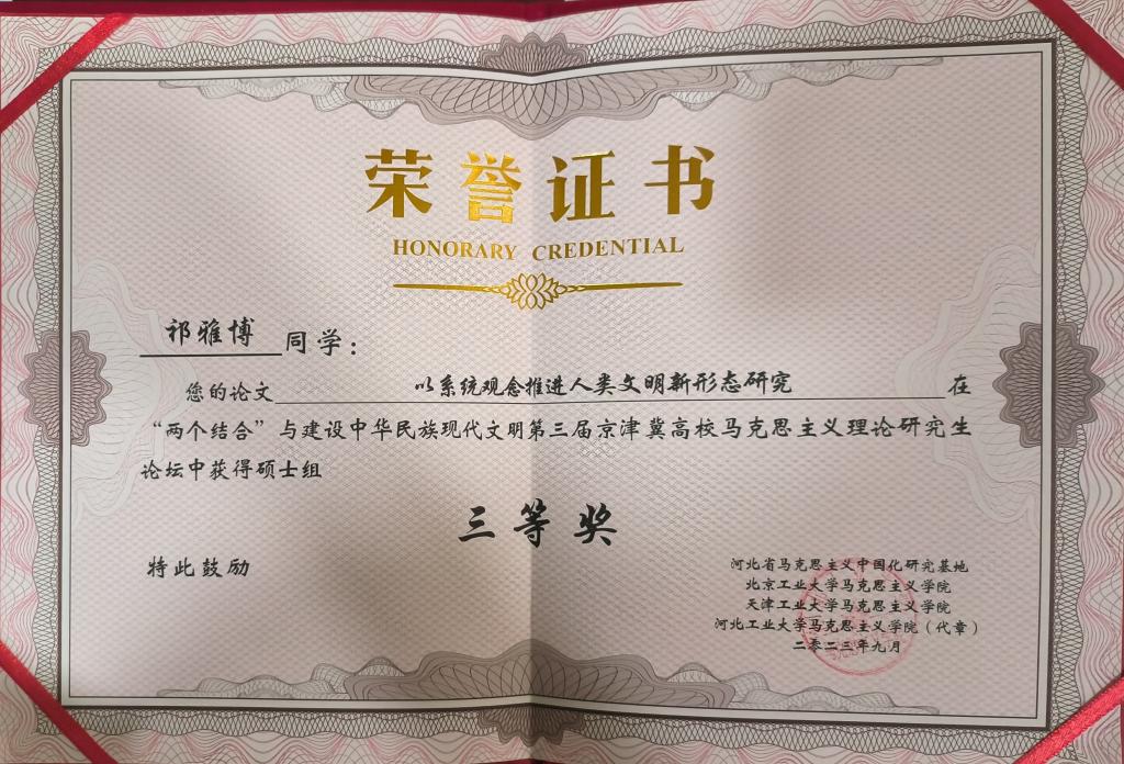 经过严格评审,由梁华平副教授、周意岷副教授指导,研究生祁雅博撰写完成的论文《以系统观念推进人类文明新形态研究》入选并在大会分论坛进行交流发言,受到与会点评人的认可和较高评价。