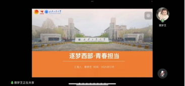 接着,蔡梦芝同学进行了“逐梦西部·青春担当”主题汇报。蔡梦芝同学结合参与西部计划的经历,分享了青年学子在乡村振兴、基层服务中“用脚步丈量土地,用行动诠释担当”的生动故事,呼应了“青春向党、强国有我”的时代号召,引发同学们对“何为青春担当”的深度思考。