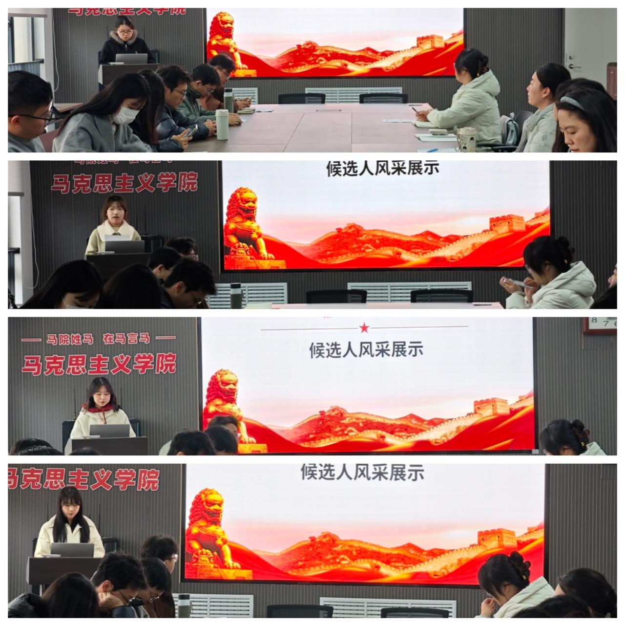 在个人陈述环节,22位候选人围绕入党动机、现实表现与不足改进三个方面,结合自身学习、实践与思想实际进行限时阐述。大家摒弃空话套话,以具体事例展现自身成长与贡献,客观剖析缺点不足,充分体现了马院学子求真务实、自觉锤炼党性的精神风貌。