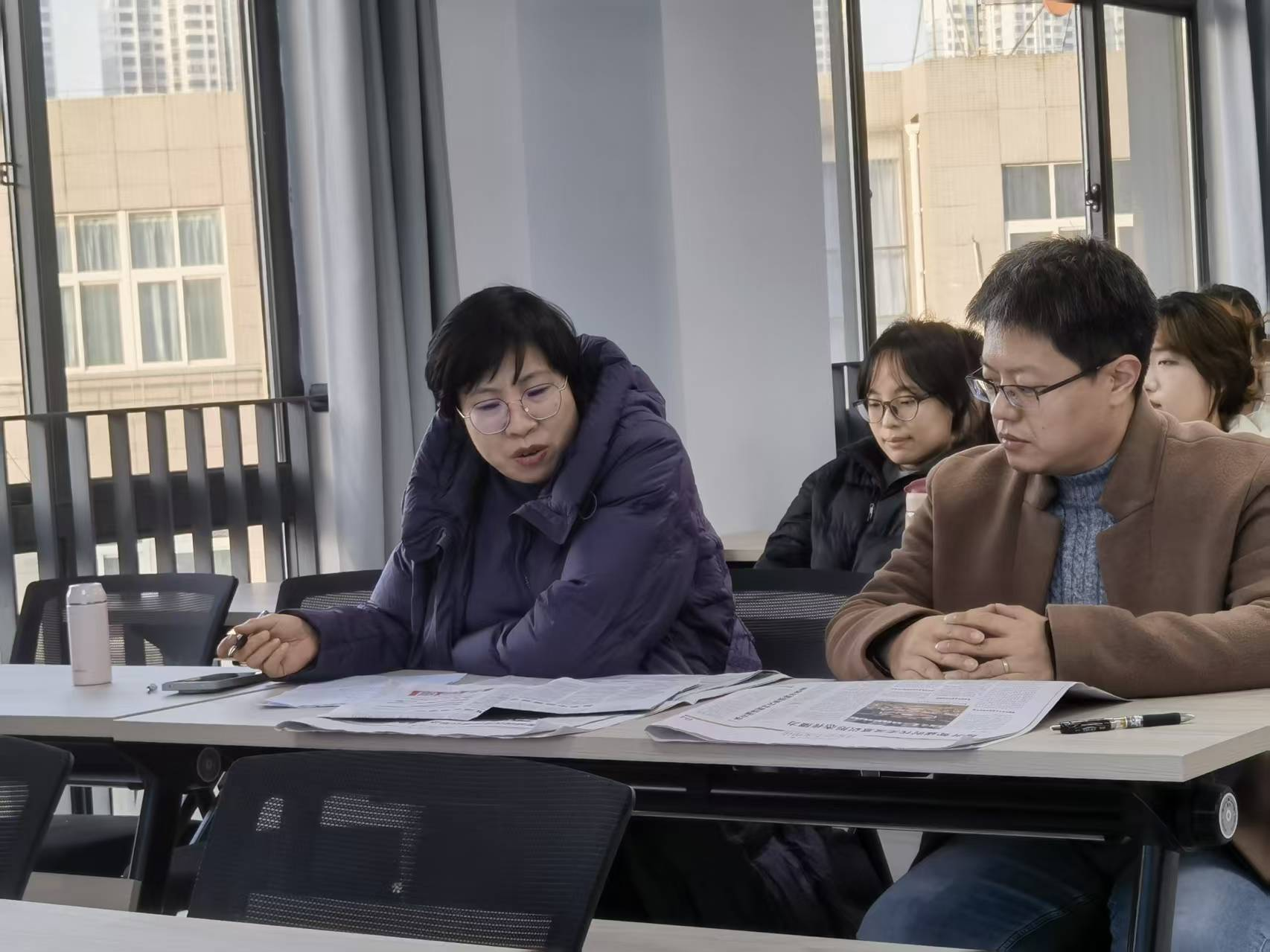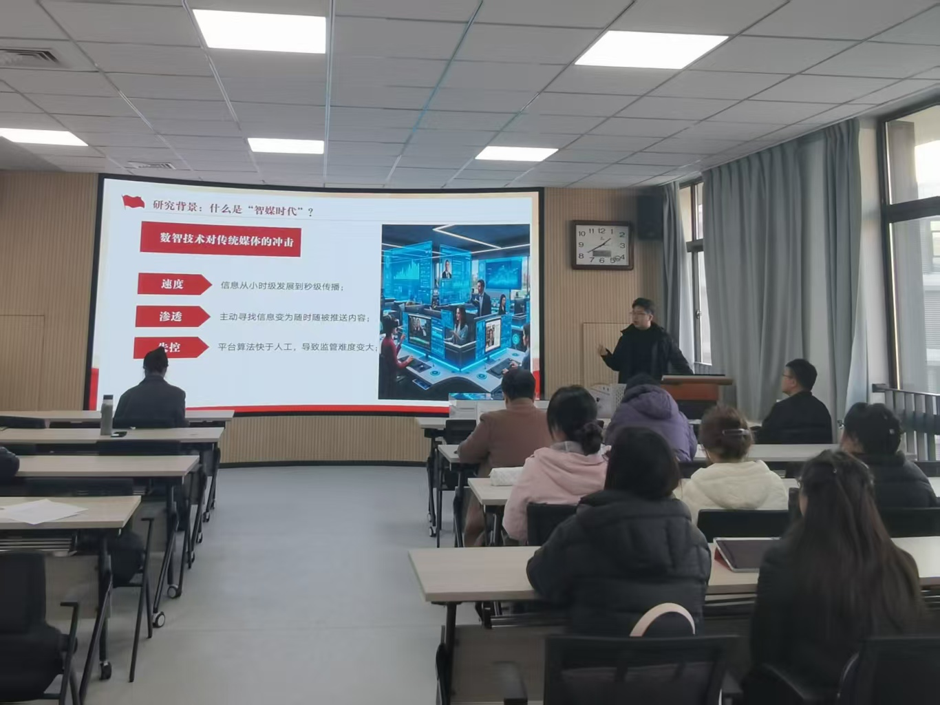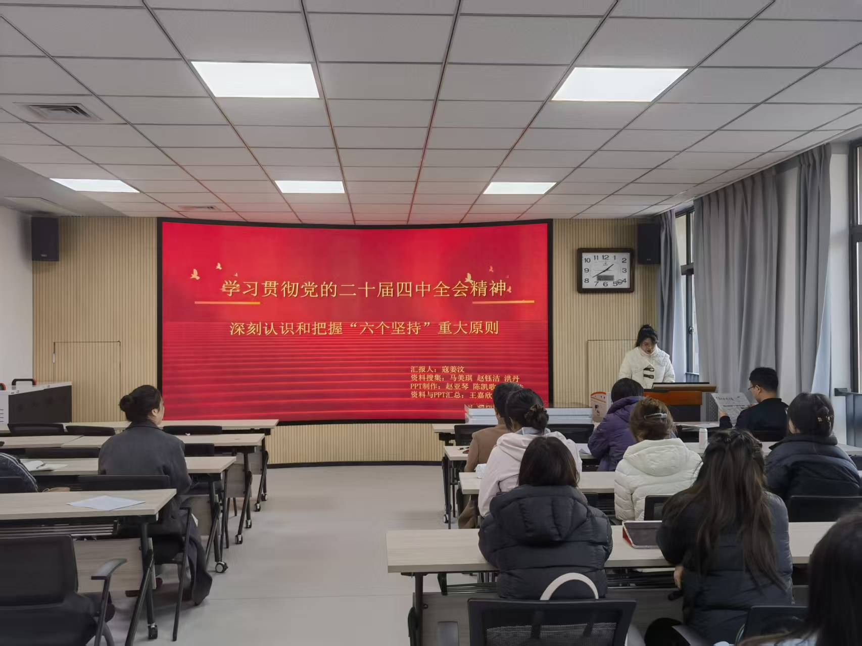活动以“报纸阅读+时政分析”为形式,围绕《中国社会科学报》前沿文章展开深度研读与研讨。三位主讲研究生结合学科理论与时代关切,进行了每人10分钟主题汇报:田泽聚焦如何提升“提升智媒时代主流意识形态传播力”,阐释其时代意义与当代青年如何辨别网络信息真伪;任莹莹以“数字中国建设步入全面深化新阶段”为题,指出建设要以数据要素为基础,人工智能+为核心引擎、深度融合为路径,治理监管为保障的系统框架;寇姜汶基于学习贯彻党的二十届四中全会精神 深刻认识和把握“六个坚持”重大原则的视域下,分析十五五时期该如何继续坚持“六个坚持”。汇报主题涵盖国家战略、育人体系、精神引领等多个维度,展现了同学们扎实的理论功底与开阔的学术视野。